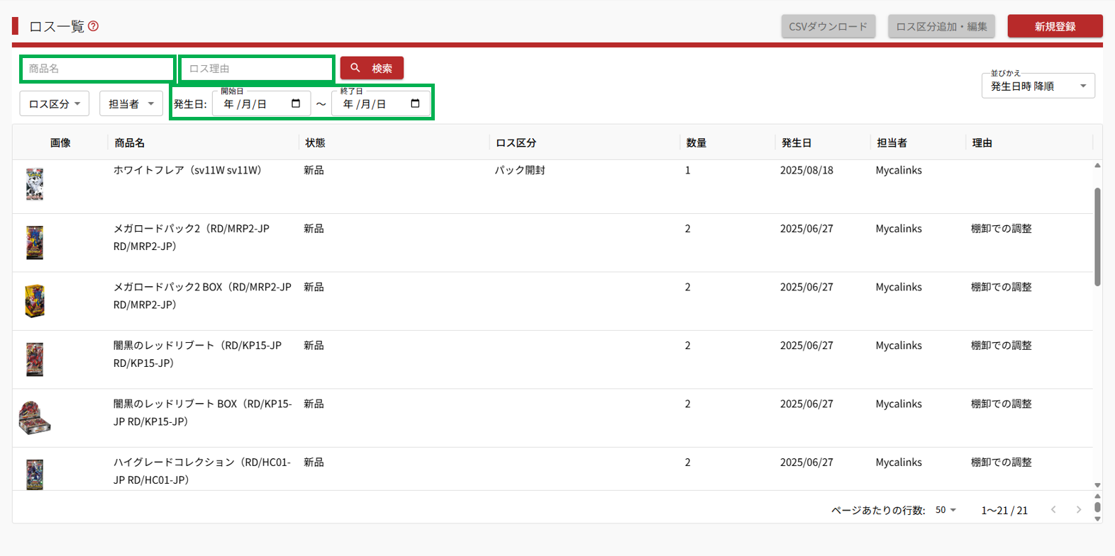■ロス一覧に商品名・期間・理由での検索機能を実装