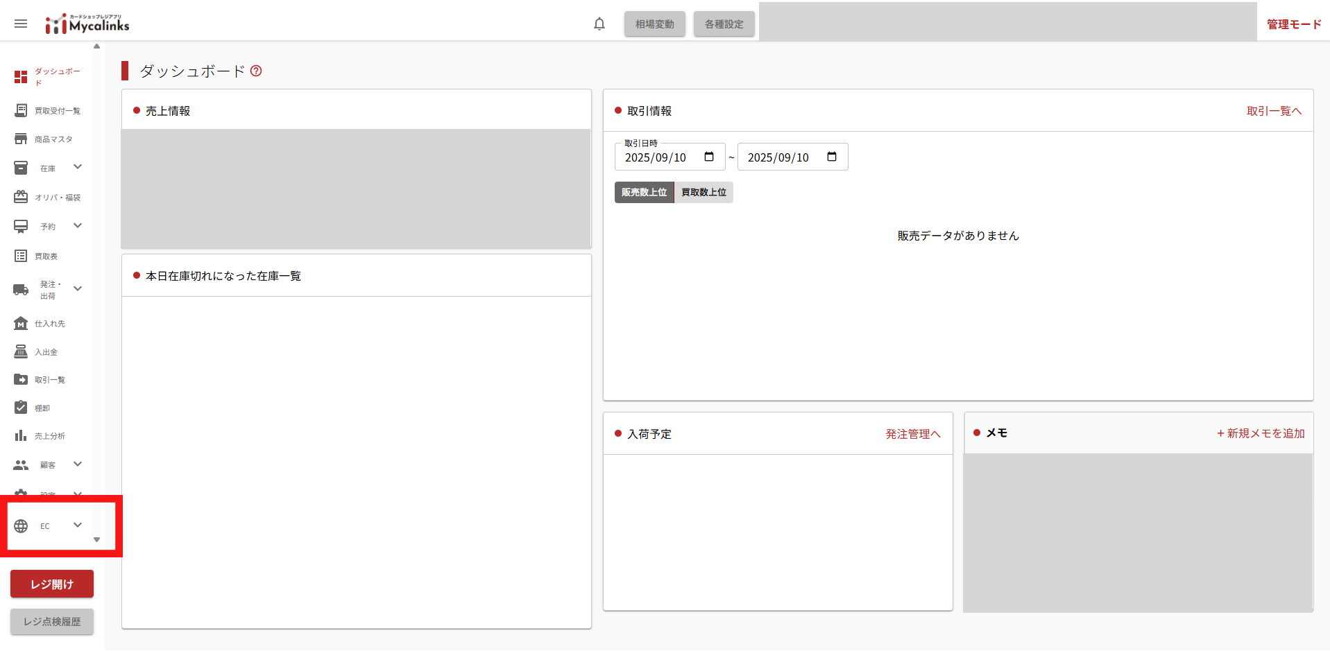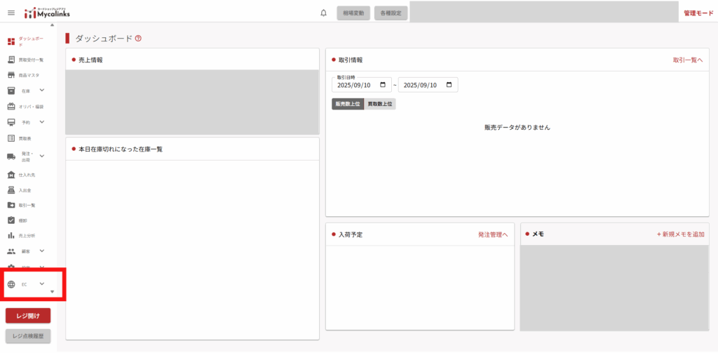 今回のアップデートに伴い、POS画面のサイドメニューに「EC」が追加されております。
