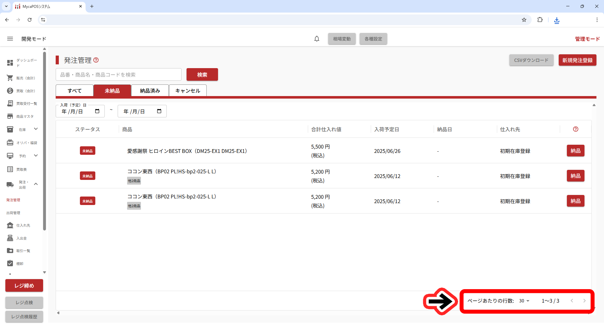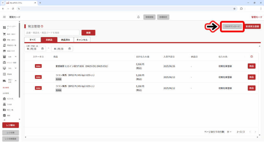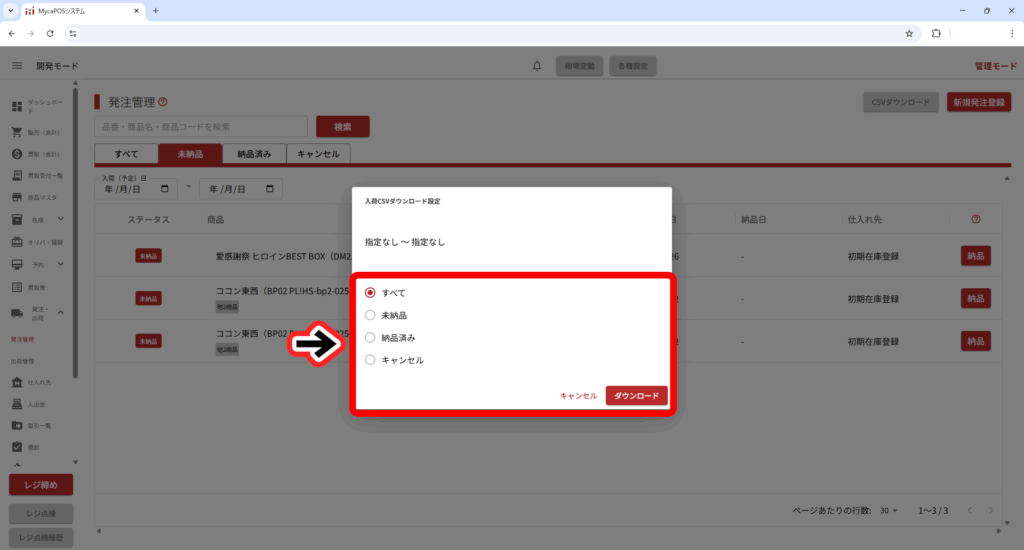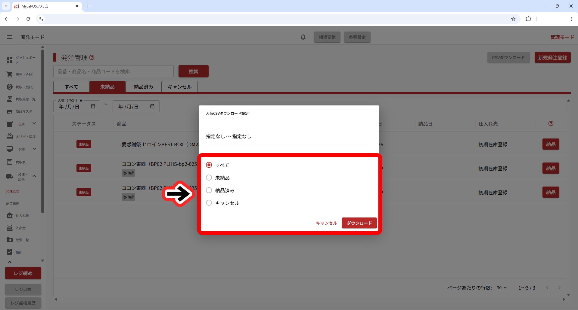 「すべて」「未納品」「納品済み」「キャンセル」から選択していただき、下の「ダウンロード」ボタンを押すと、CSVがダウンロードできます。
