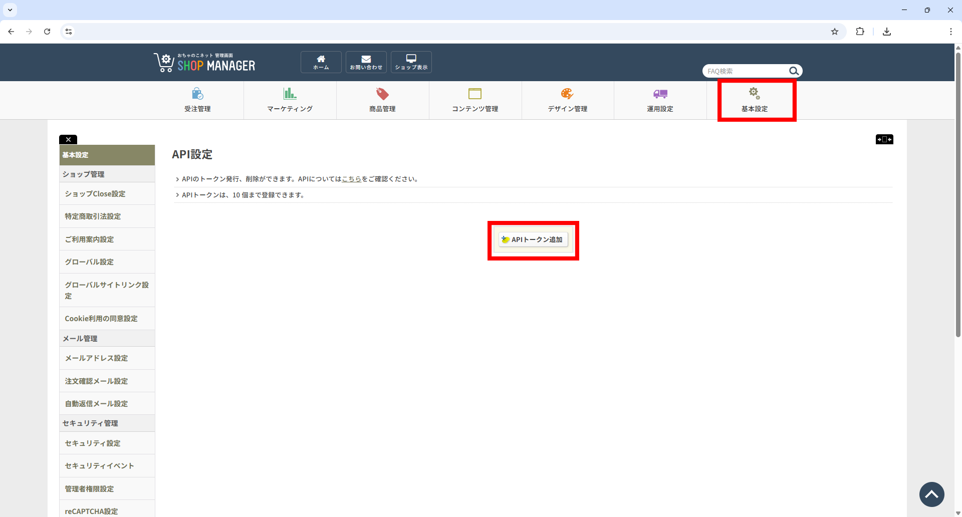 「基本設定」の「API設定」を選択していただき、「APIトークン追加」をクリックします。