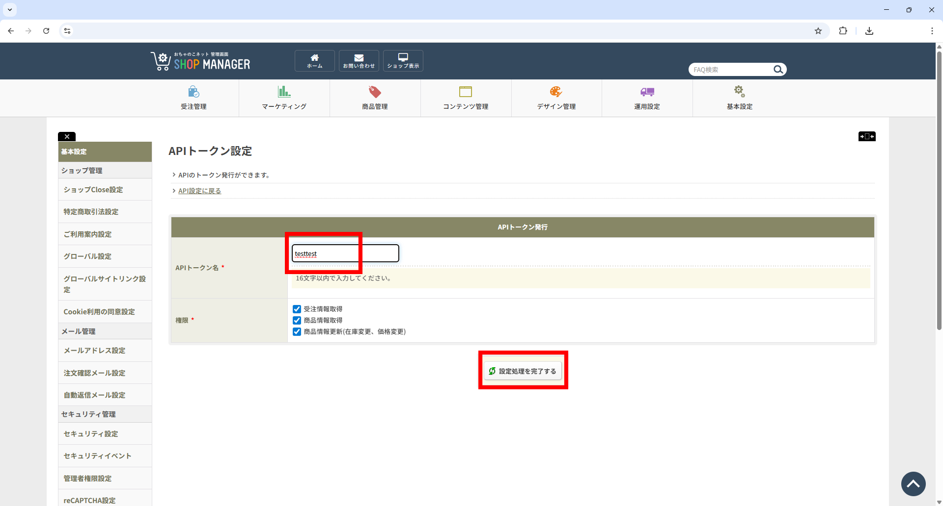APIのトークン名を設定し、チェックボックスすべてにチェックを入れたまま「設定処理を完了する」をクリックします。