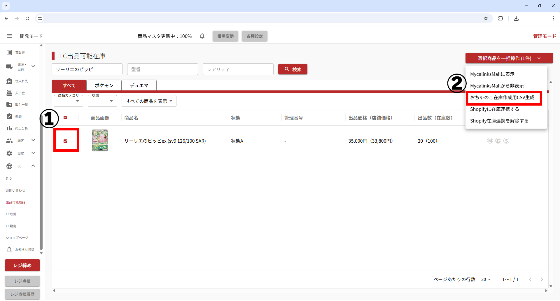 出品する商品のチェックボックスにチェックを入れます。選択が完了したら画面右上の「選択商品を一括操作」から「おちゃのこ在庫作成用CSV生成」を選択しCSVファイルをダウンロードします。