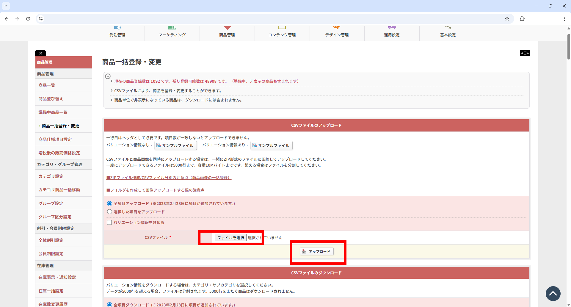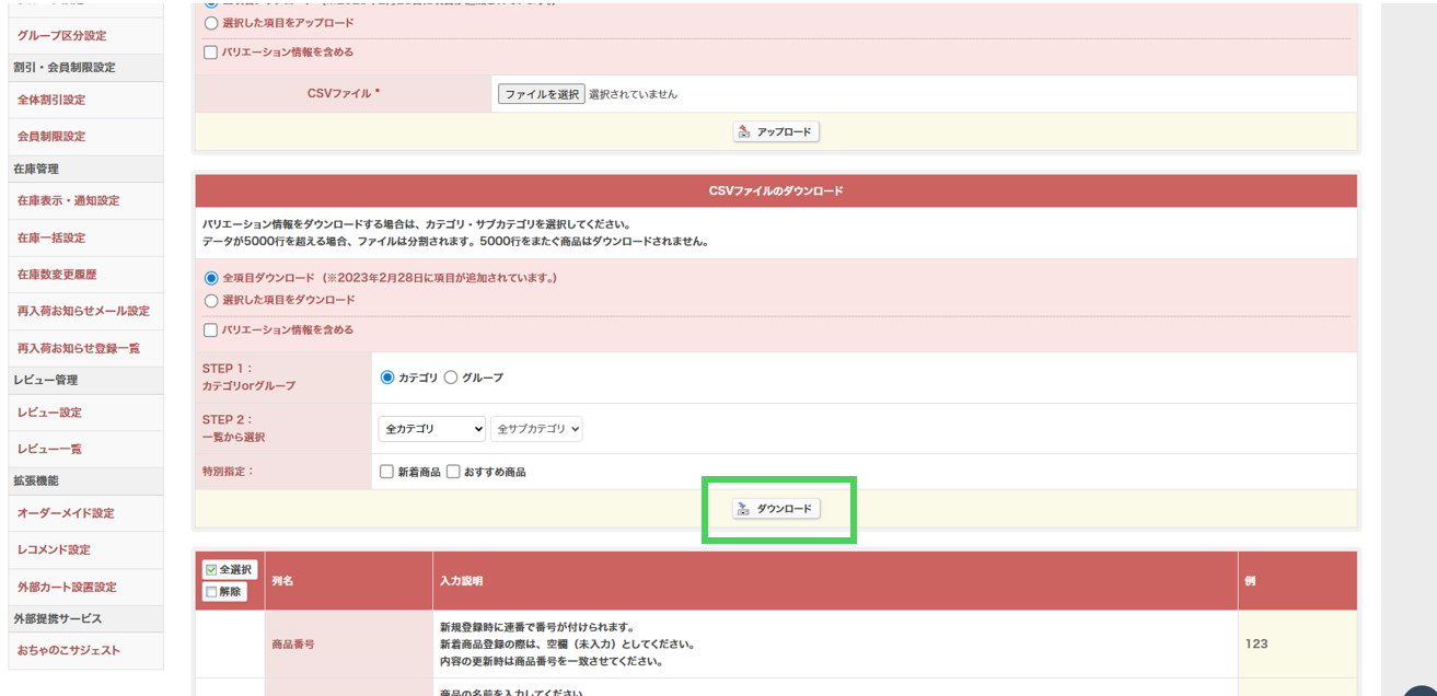 先ほどアップロード時に使った「商品管理」の「商品一括登録・変更」よりCSVファイルをダウンロードします。