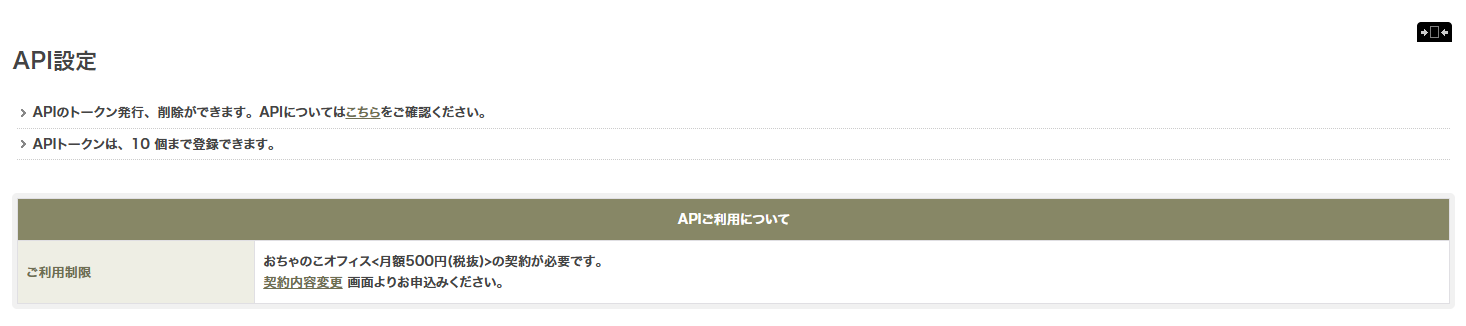 おちゃのこネットの基本設定→API設定を開いて以下のような画面が表示される場合は、API設定を利用できないためPOSとの連携ができません。