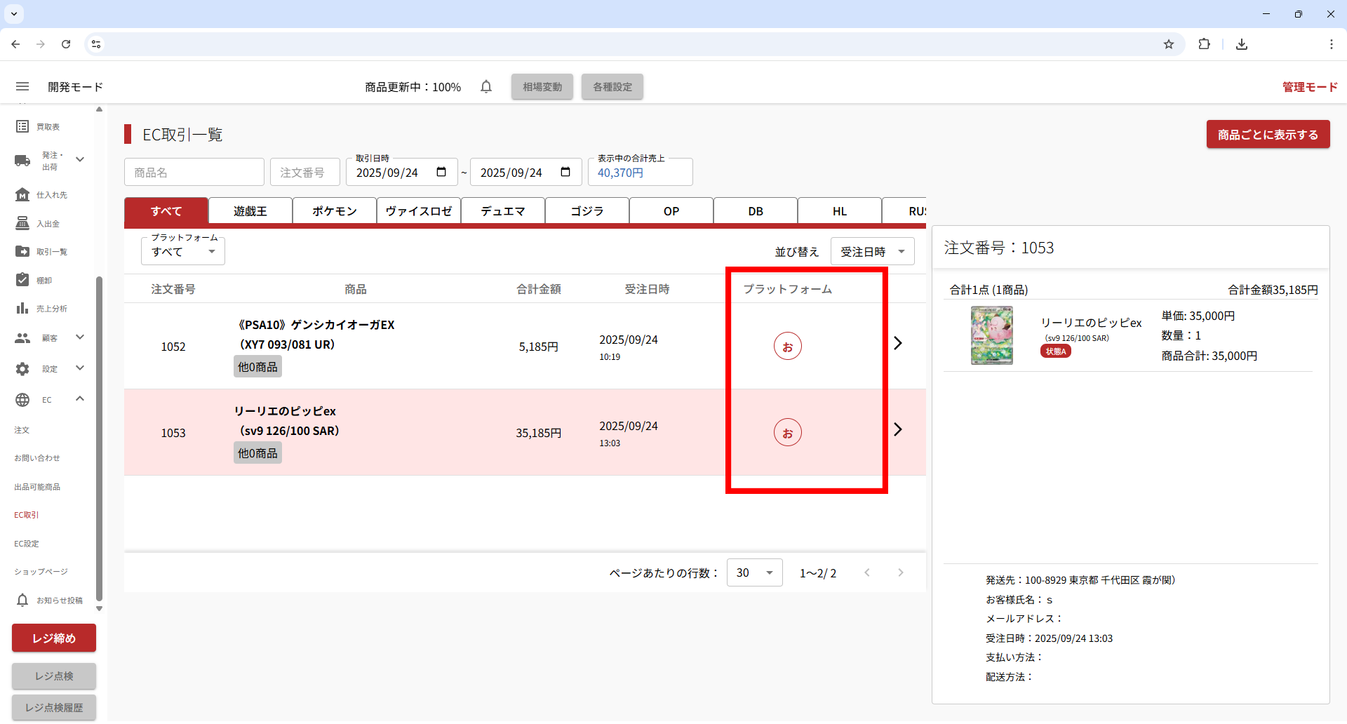 お客様にサイト上で購入いただきますと、下記画像のようにどのプラットフォームで購入いただいたかがわかるようになっております。