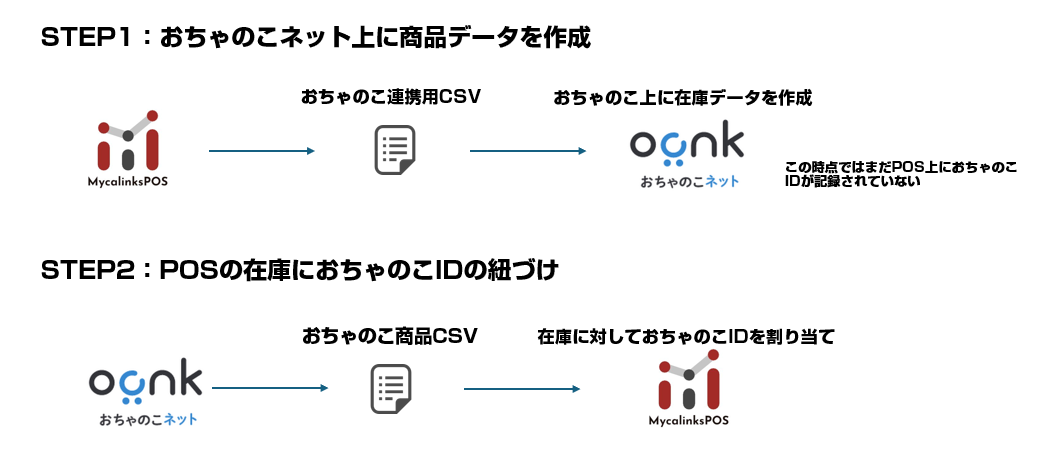 おちゃのこネット上の商品番号(おちゃのこID)とMycalinksPOSの在庫IDを紐づけることで在庫の連携を行います。
