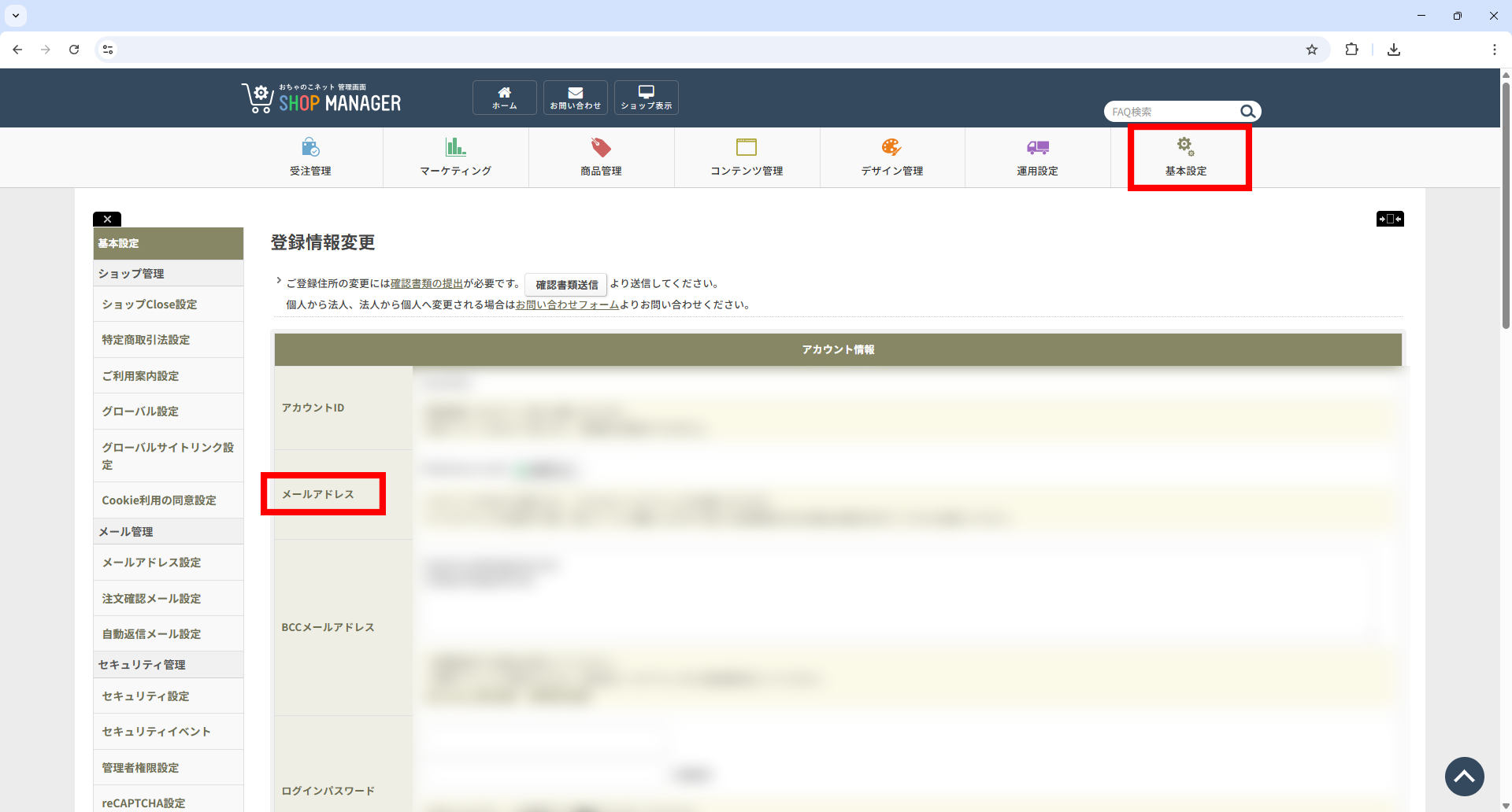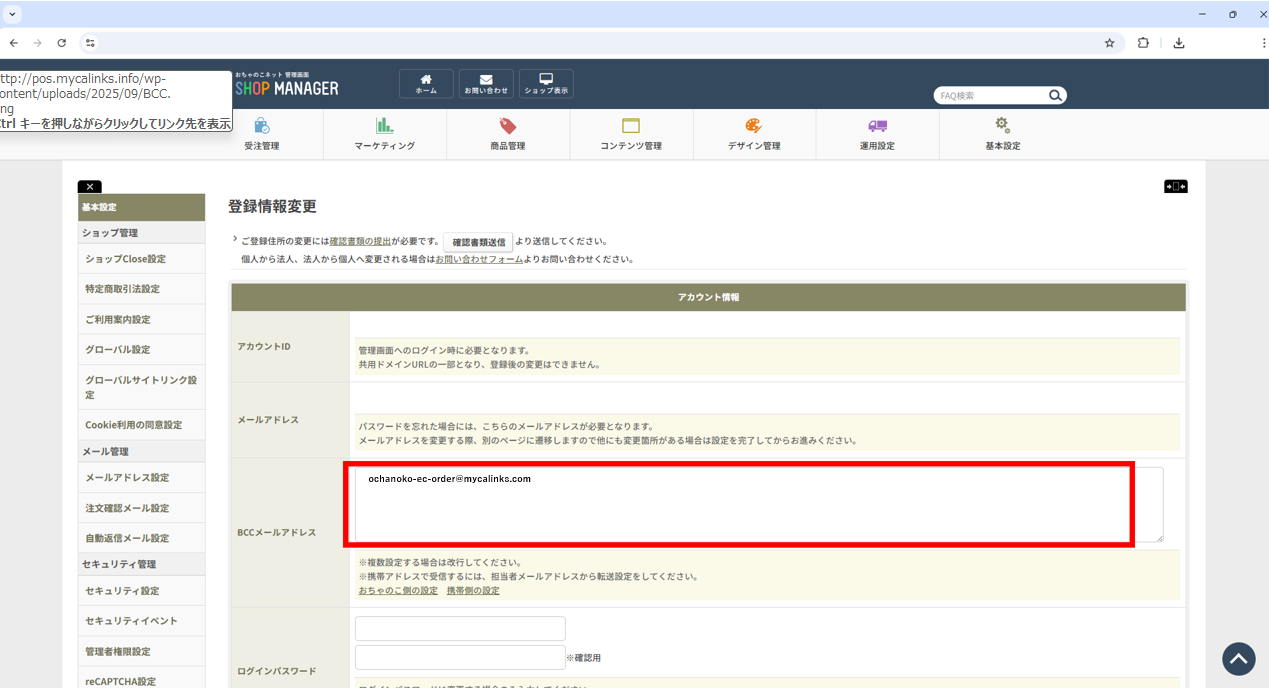 連携時メールアドレス確認で開いていただいた「登録情報変更」画面にてBCCメールアドレスの登録が必要になります。