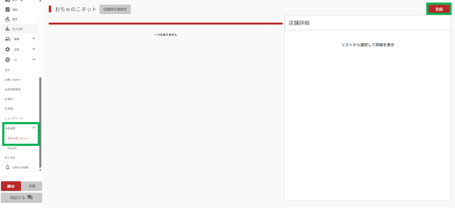 左のサイドメニューのEC欄から「外部EC連携」→「おちゃのこネット」を選択して、右上の「登録」をクリックしてください。