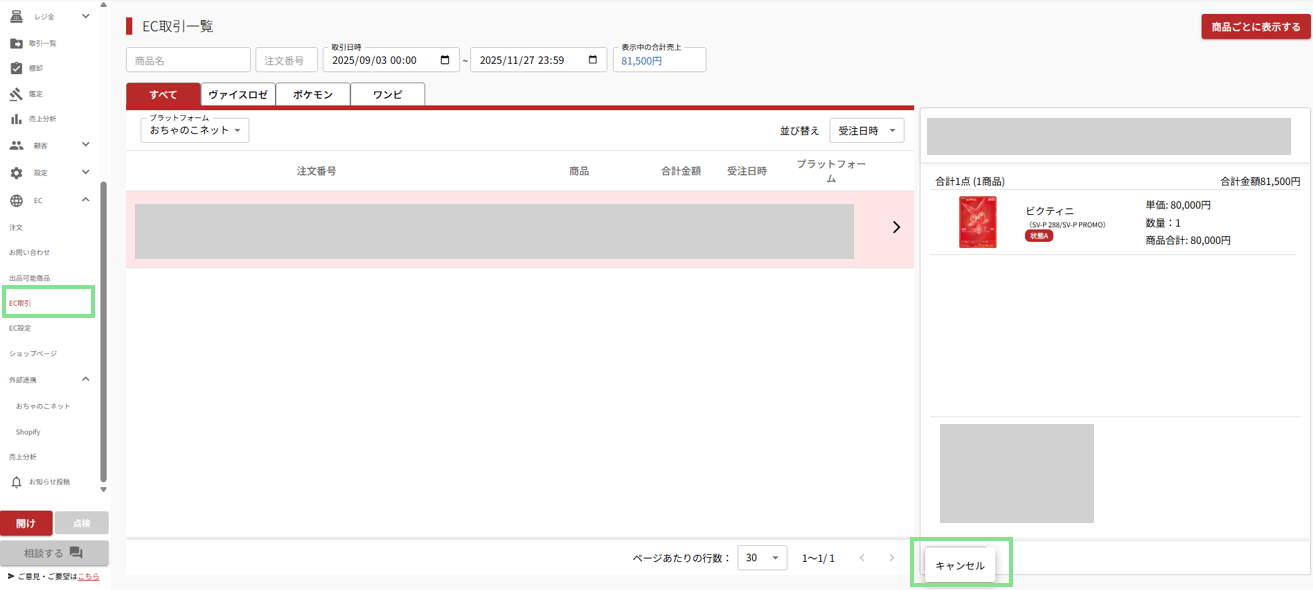 サイドメニュー「EC>EC取引」より右枠下部「各種設定>キャンセル」を選択してください。