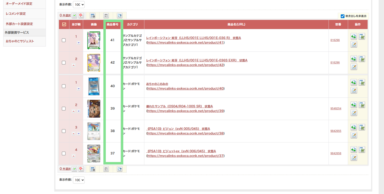 紐づけたい商品のおちゃのこIDを確認します。おちゃのこID はおちゃのこ管理画面「商品管理>商品一覧」より確認できます。商品番号がおちゃのこIDです。