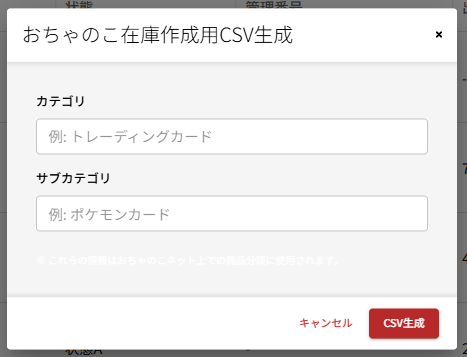 おちゃのこネットに登録済みのカテゴリ・サブカテゴリ名を入力して「CSV生成」ボタンを押してください。