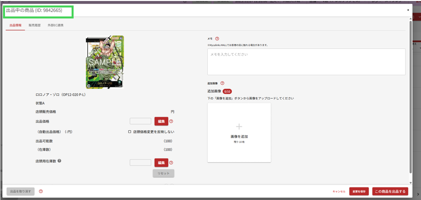 型番/品番の欄にPOSにおける在庫IDを入力して保存してください。在庫IDは「出品可能商品一覧」から商品を選択していただく他、在庫一覧からDLしたCSVでも確認いただけます。