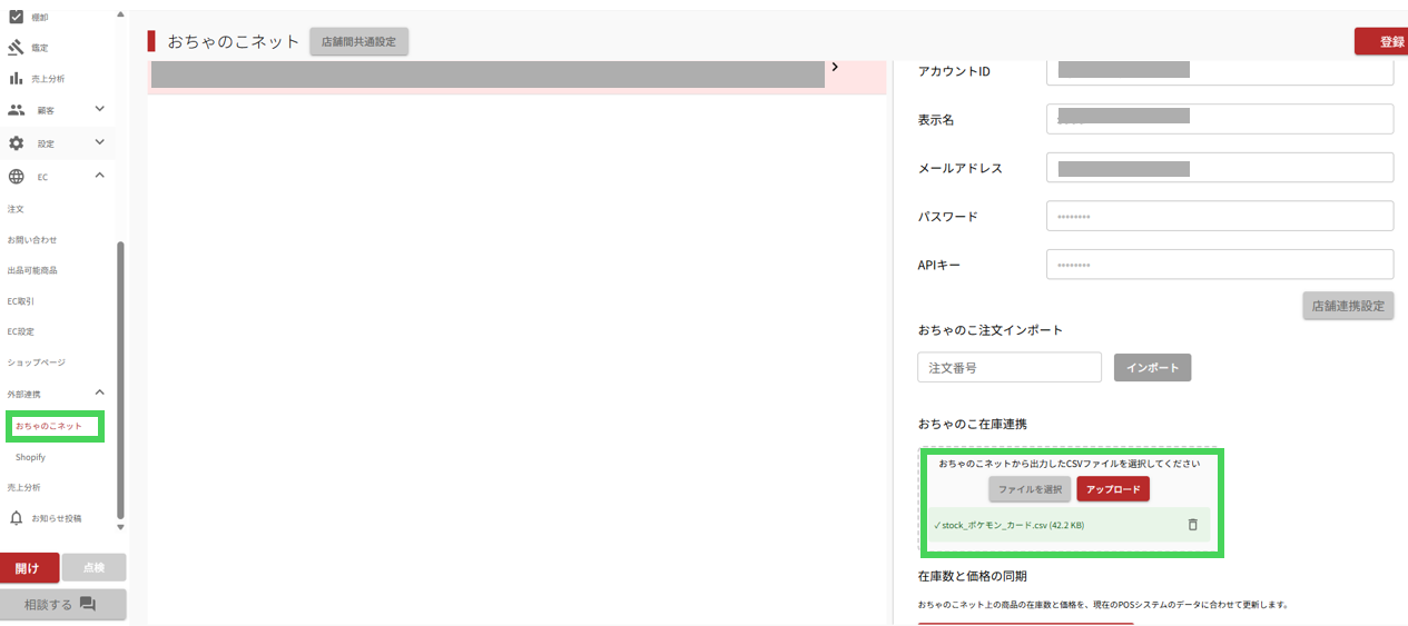 サイドメニュー「EC>外部連携>おちゃのこネット」よりアップロードできます。アップロードが完了したら連携は完了です。