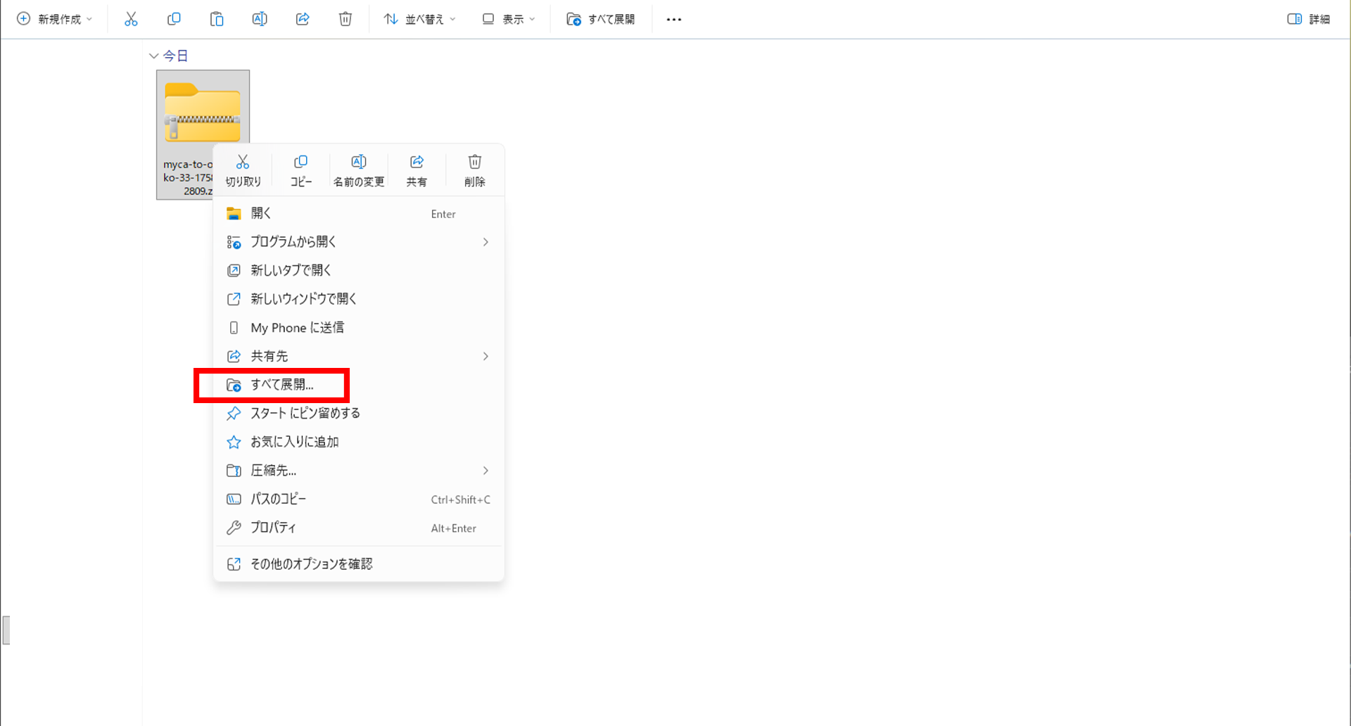一度右クリックをし、「すべて展開」をして展開したフォルダ内にあるzipファイルをアップロードしてください。