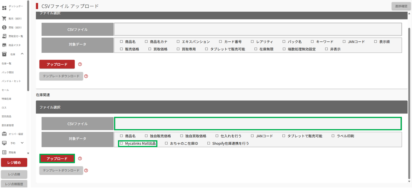対象データの「MycalinksMall出品」にチェックを入れて、「アップロード」を選択します。