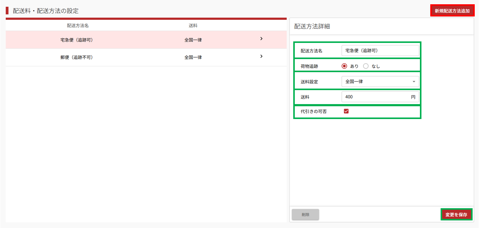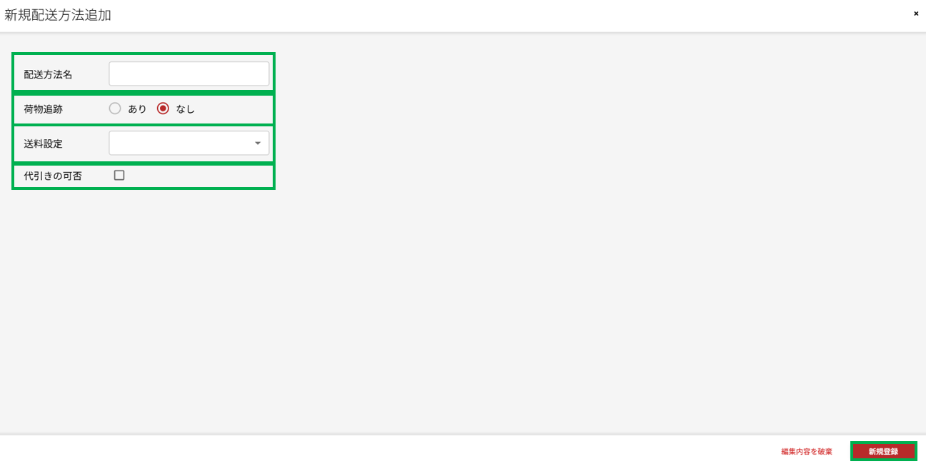 「新規配送方法追加」のボタンを押して、必要な情報を入力して新規登録してください。