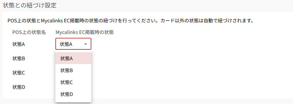 状態との紐づけ設定でPOS上の状態名を、MycalinksMALL掲載時にどの状態名に適用するかをそれぞれ選択してください。