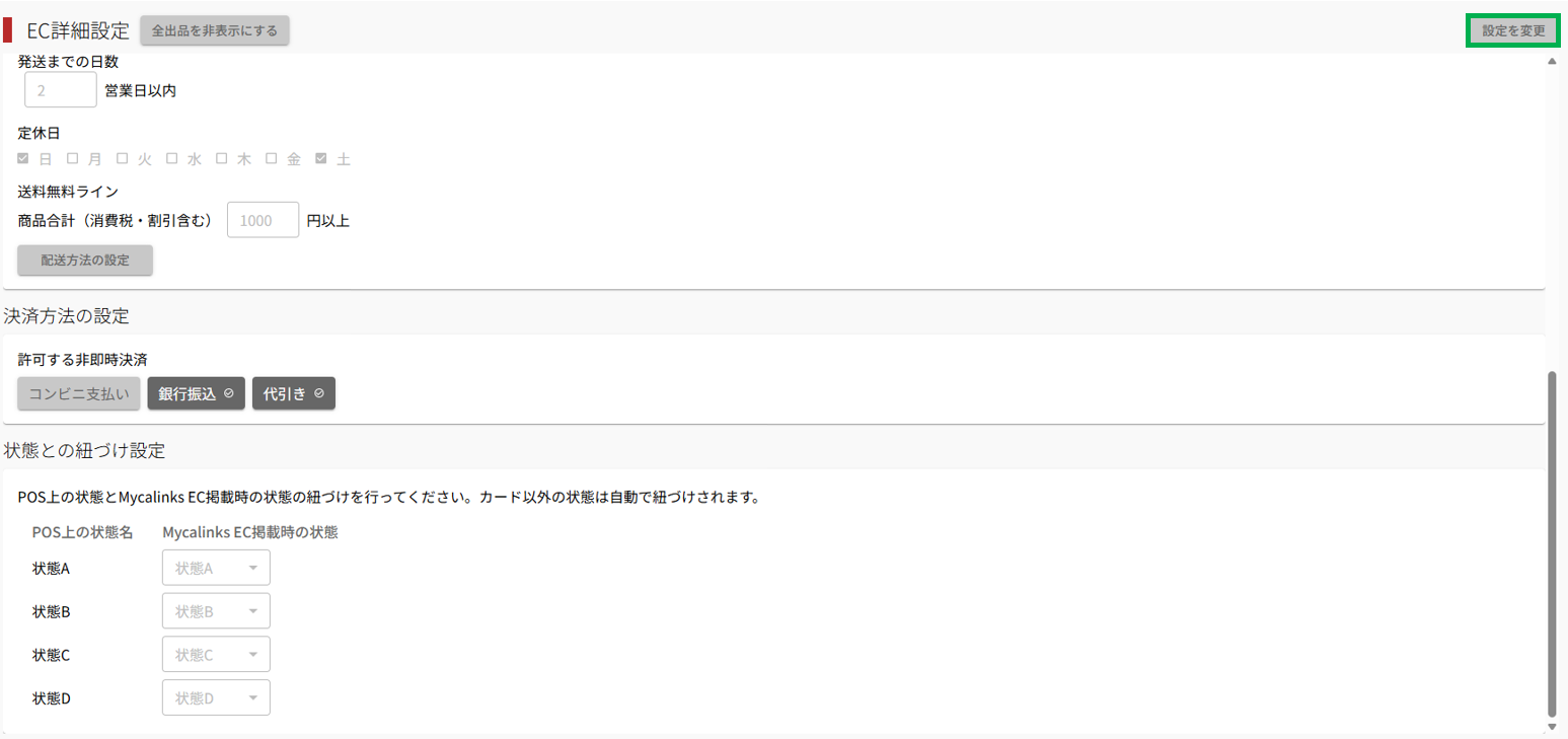 EC詳細設定の状態との紐づけ設定にて、POS上の状態と、MALL掲載時の状態の紐づけを行ってください。カード以外の状態については自動で紐づけられます。