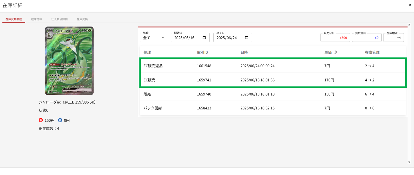 在庫一覧の在庫詳細→在庫変動履歴でもECに関する在庫変動を確認できます。