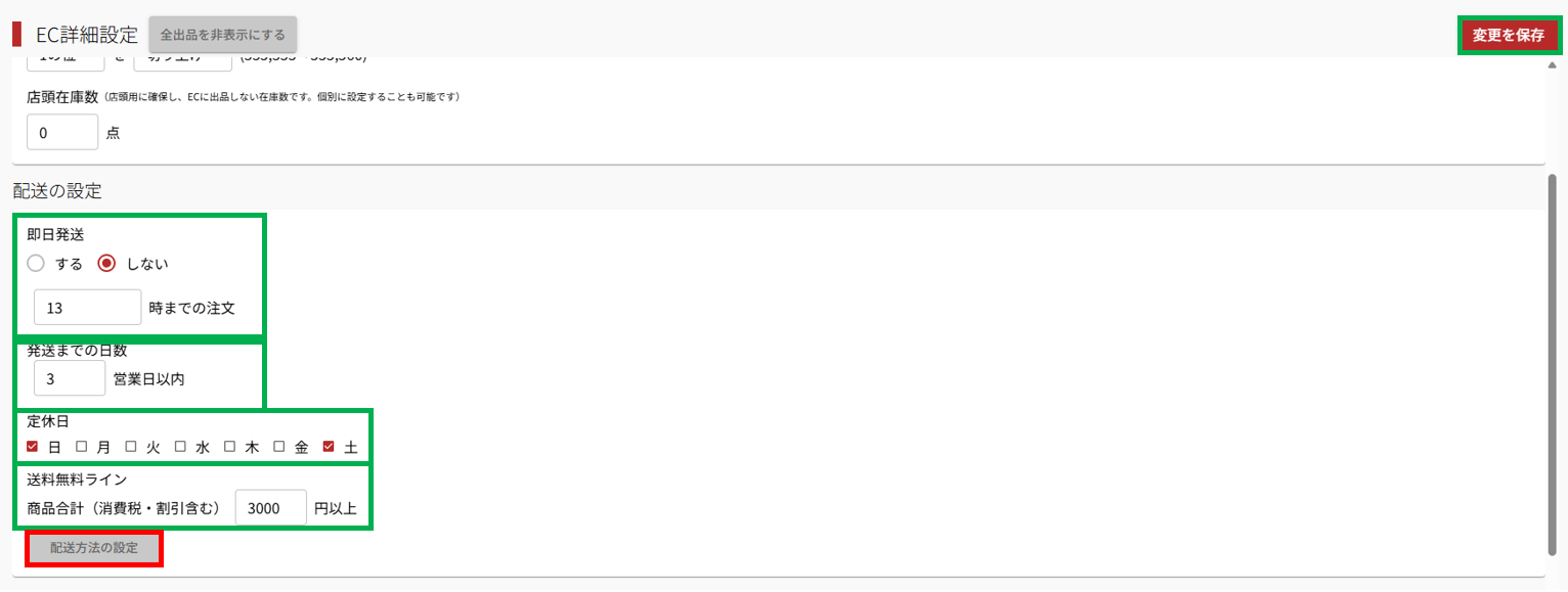 「配送方法の設定」というリンクをクリックすると、送料・配送方法の設定画面に移行します。