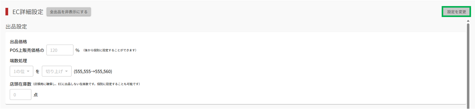 サイドメニューの「EC/EC設定」からEC詳細設定を開き、「設定を変更」を押します。