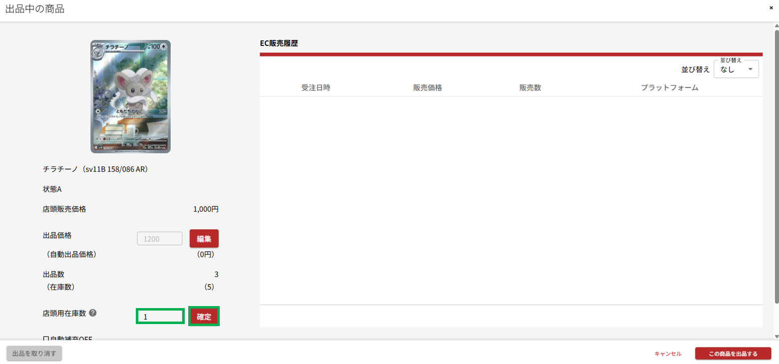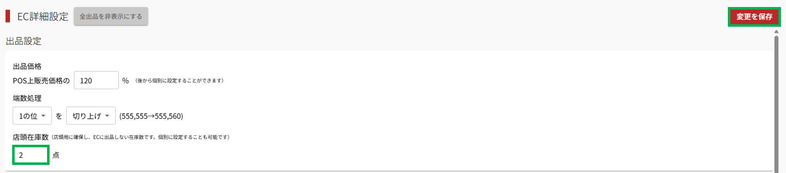 出品設定の店頭在庫数で店頭用に確保し、ECに出品しない在庫数を入力します。