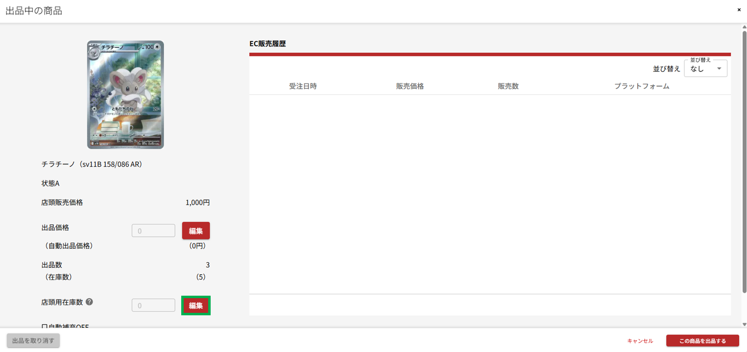 また、「EC出品在庫リスト」の各在庫詳細からは、商品ごとに個別の店頭用在庫数を設定することが可能です。この個別設定は、全体設定よりも優先されます。