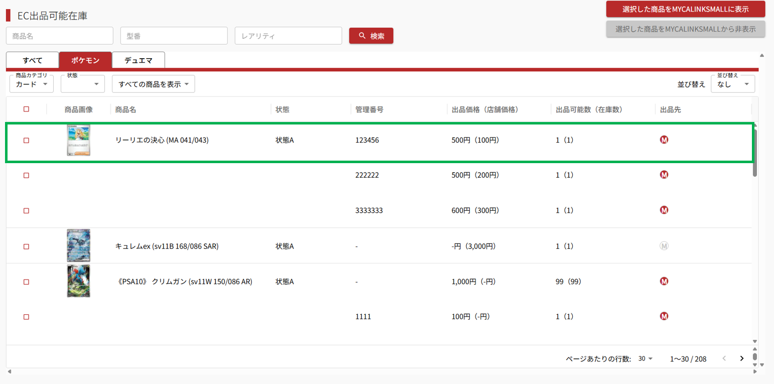 EC出品在庫リストから価格を変更したい商品を選択します。