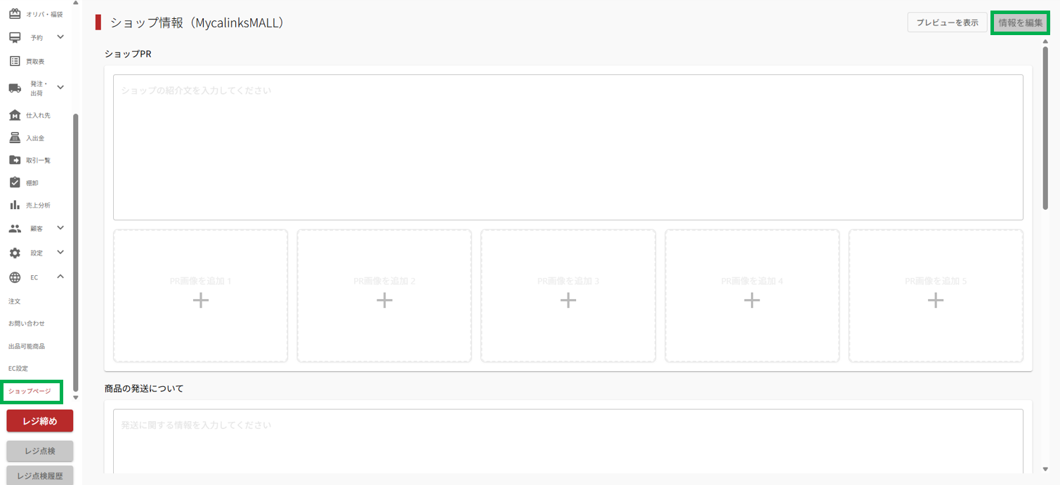 サイドメニューの「EC/ショップページ」から「情報を編集」を押します。