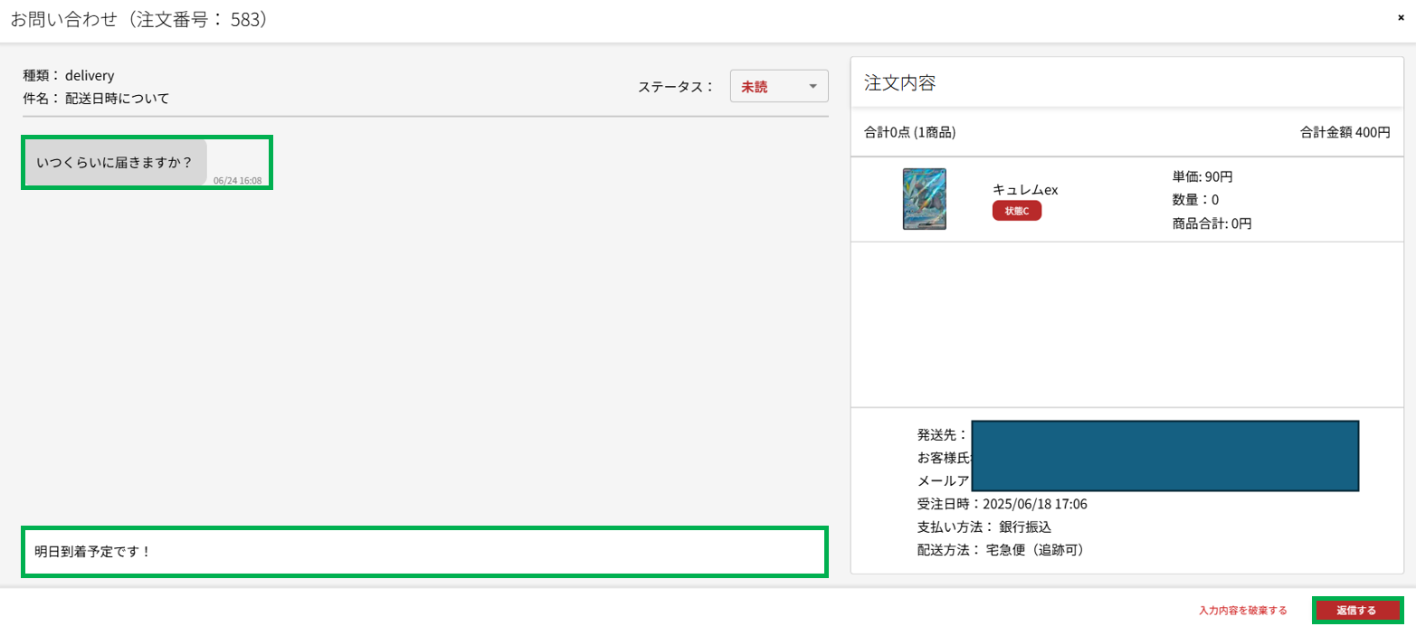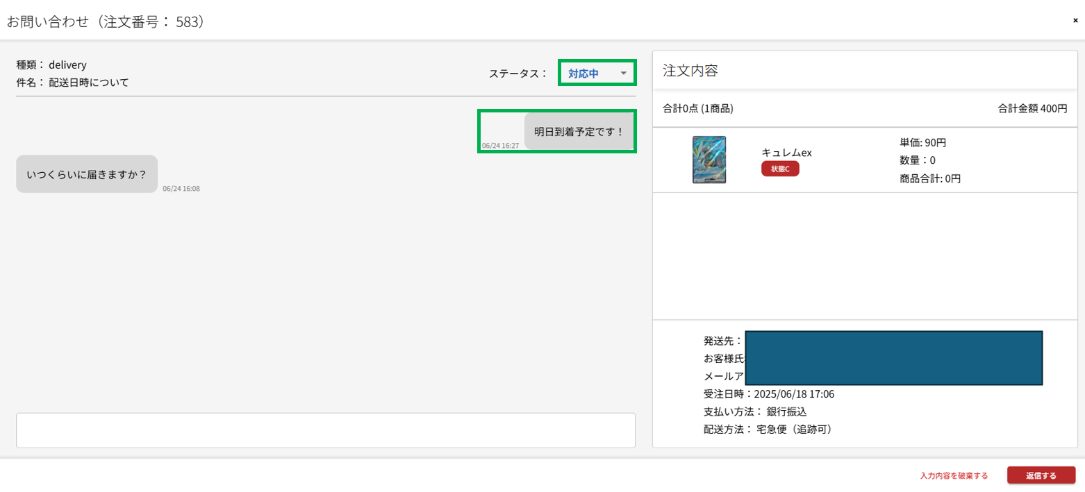 ステータスが対応中に変わり、返信メッセージが送られます。