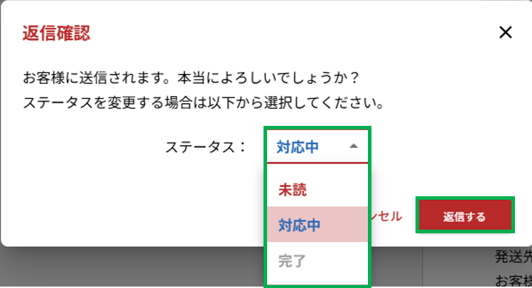 ステータスを変える場合はプルダウンから対応中」に変更し、「返信する」を押します。