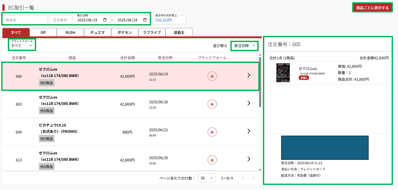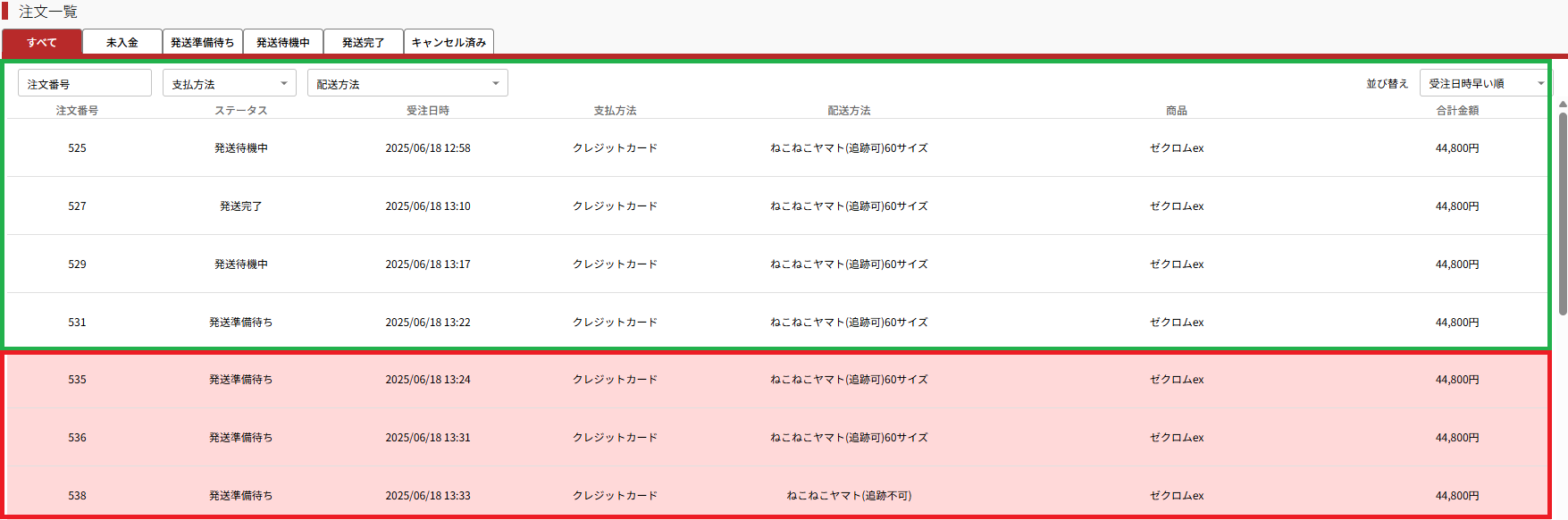 未確認の注文は「未読」としてマークされ、背景が赤色で表示されます。