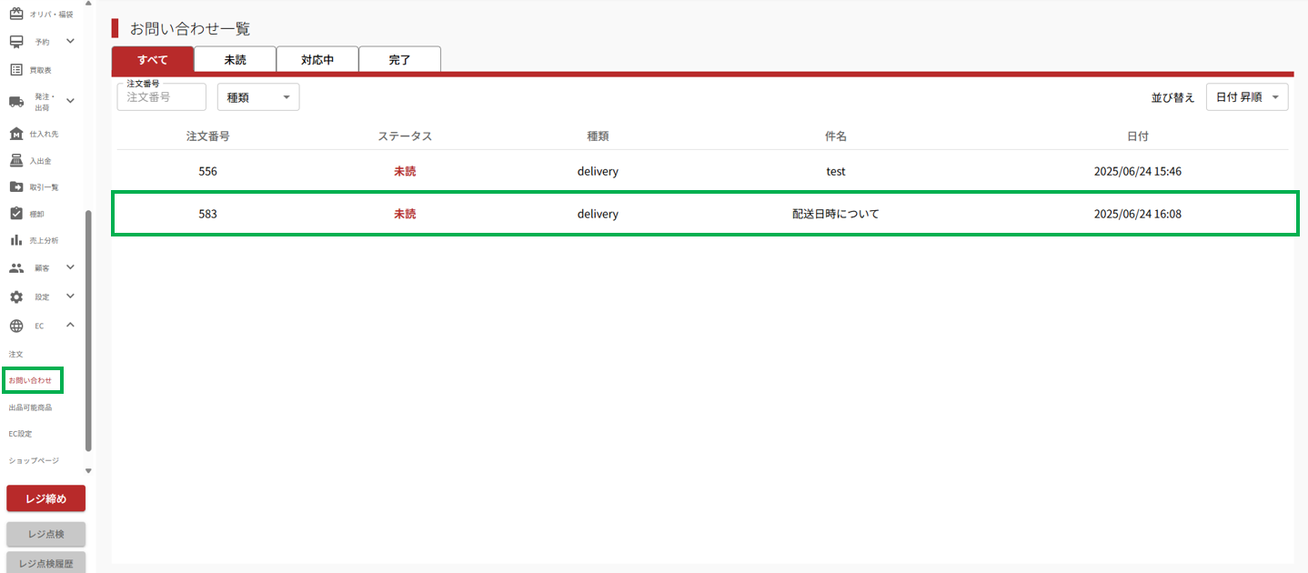 サイドメニューの「EC/お問い合わせ」からお問い合わせ一覧を開くことができます。