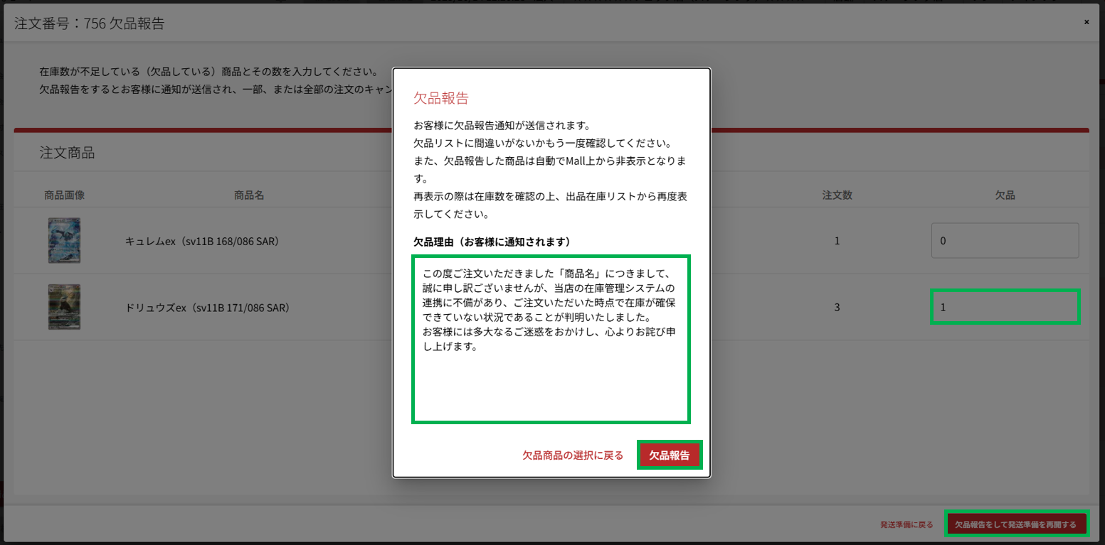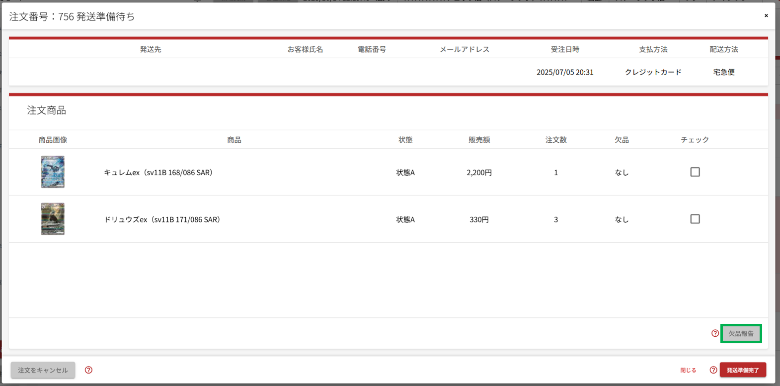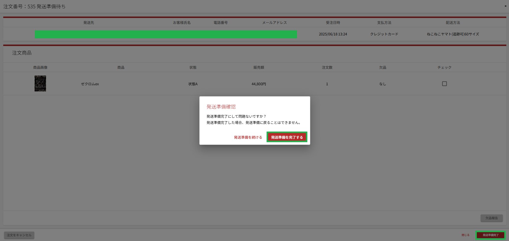 3. 「発送準備完了」をクリックすると、発送準備確認モーダルが表示されます。