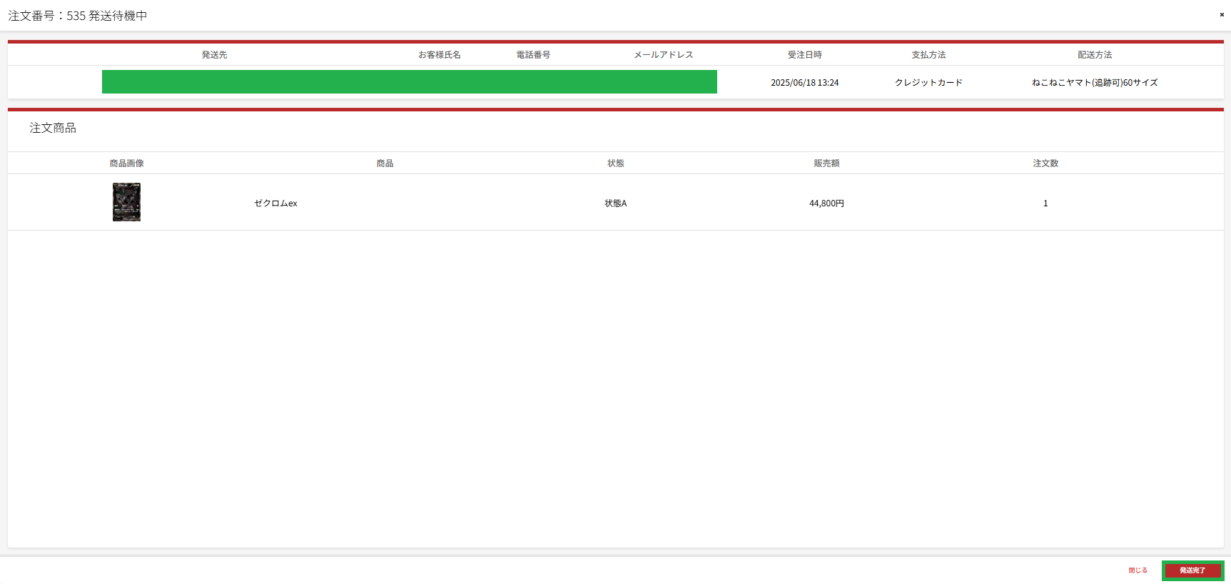 発送完了を押すと通常の注文と同様に「発送完了」にステータスが変更されます。