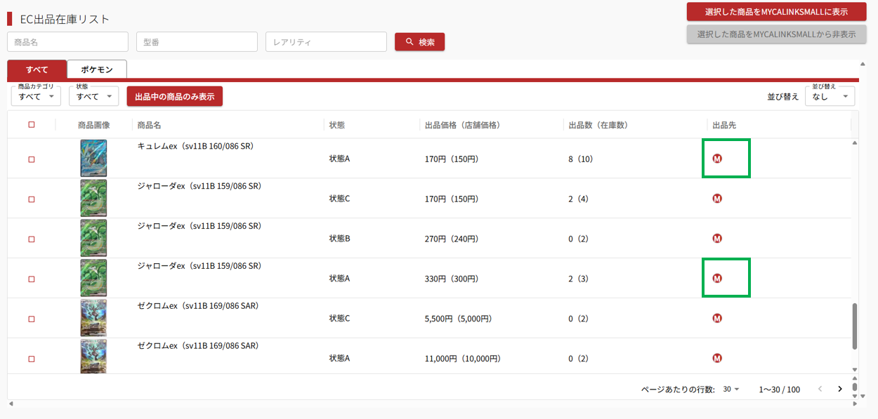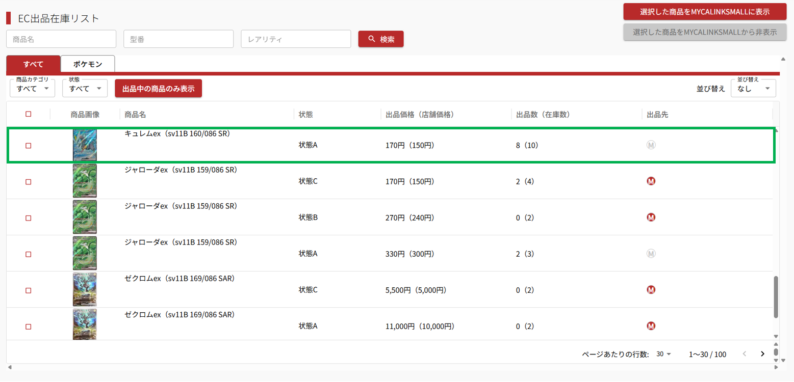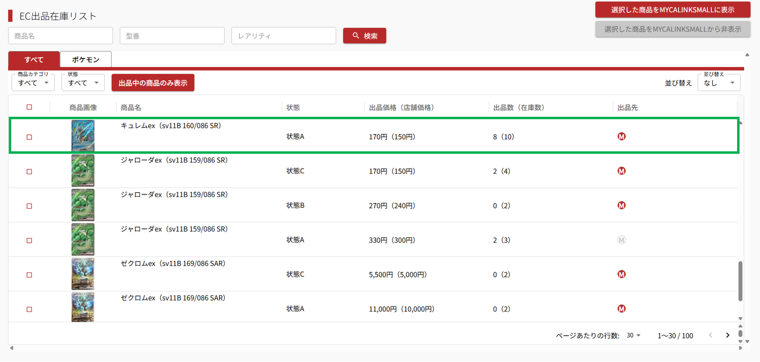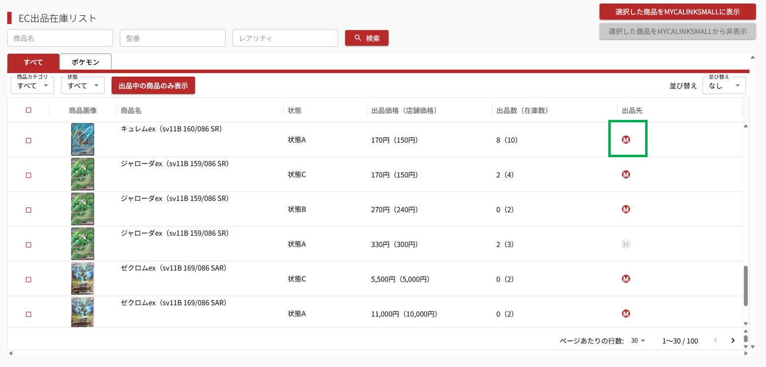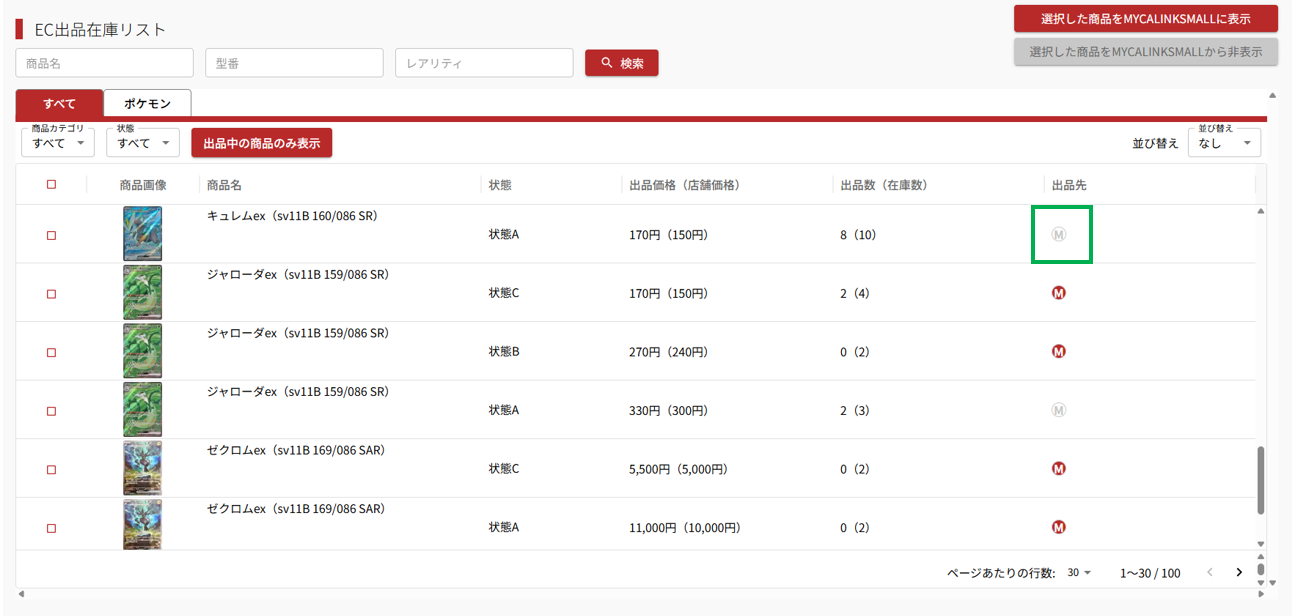 ECサイトへの出品を取り消すには、出品商品のMycalinks Mallへの非表示設定をする必要があります。