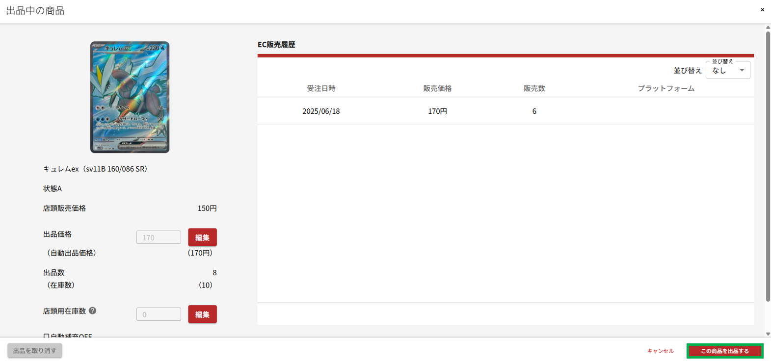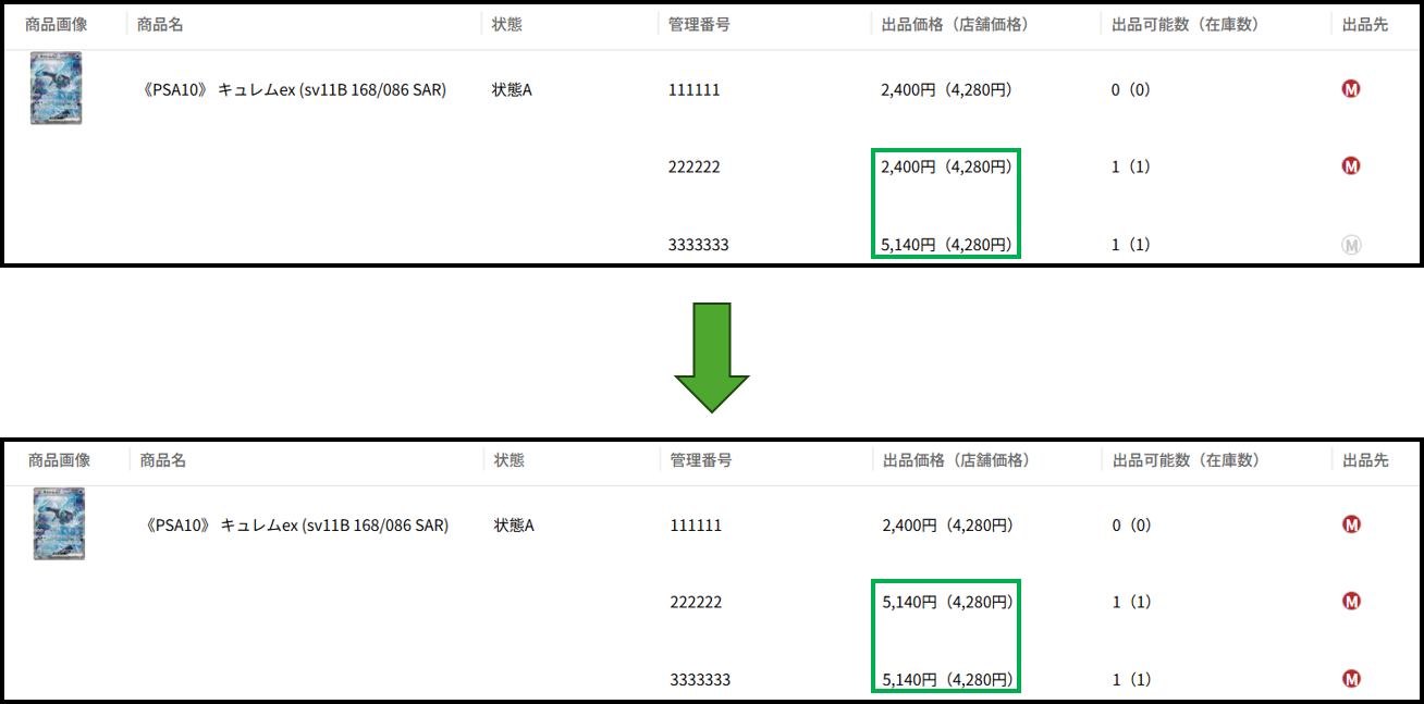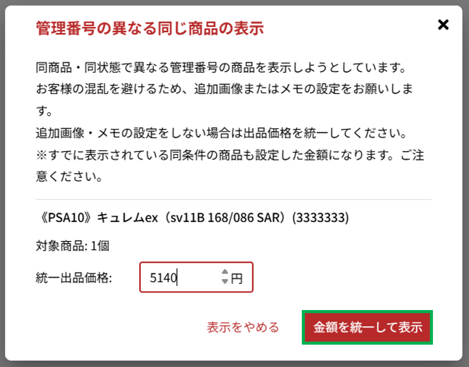統一出品価格を入力して「金額を統一して表示」を押すと、すでに表示されている商品(在庫がある物に限る)も統一出品価格で表示されるよう変更されます。