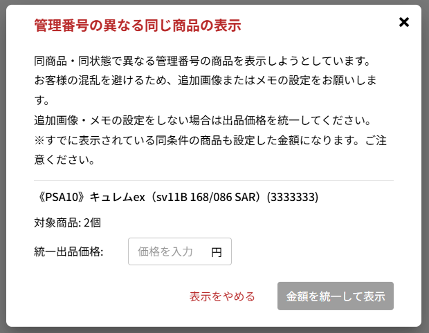 管理番号の異なる同じ商品をモールに表示しようとすると、以下のようなポップアップが表示されます。