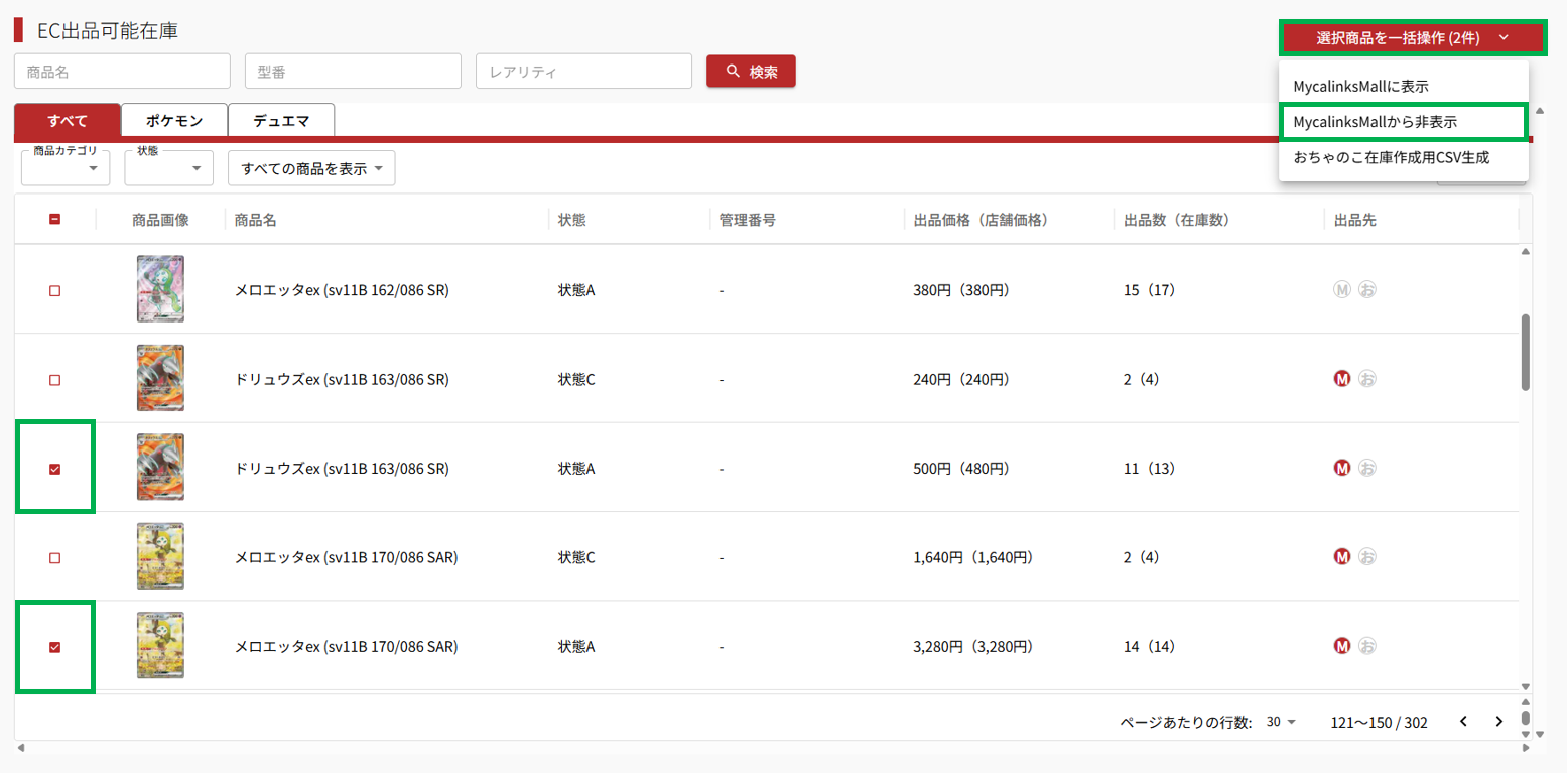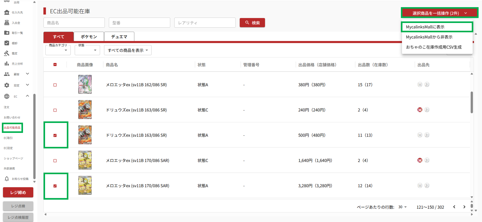 3.「選択商品を一括操作(〇件)」のプルダウンを開き、「MycalinksMallに表示」を押します。