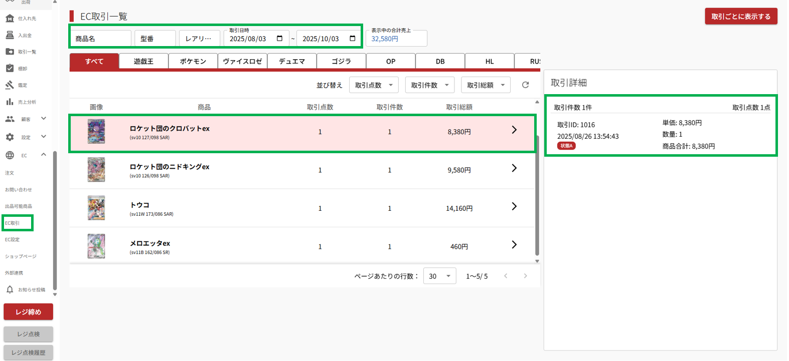 取引日時・商品名・型番・レアリティを入力して検索することができます。