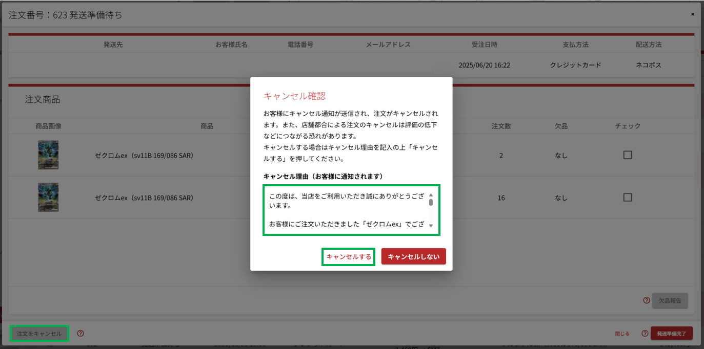 これにより購入者にメールが送られ、注文がキャンセルされます。