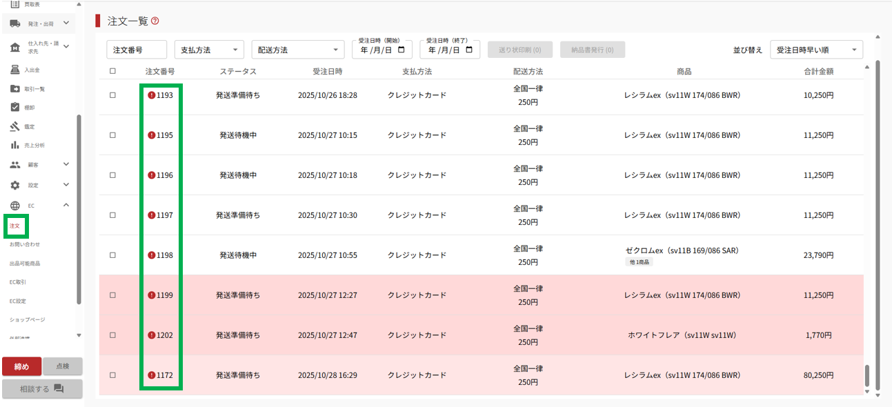 ほしいものリストからの注文があった場合には、ECの注文一覧画面の注文番号に「!」マークがついています。