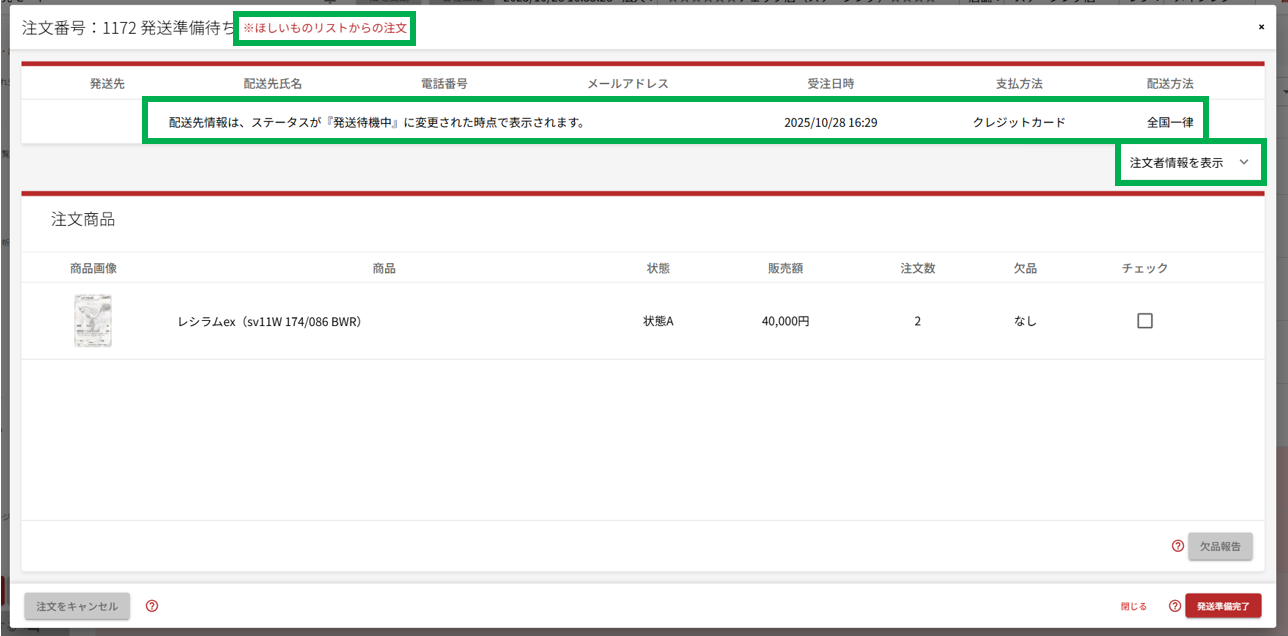 注文詳細では「発送待機中」にステータスが変更されるまで配送先情報は表示されません。