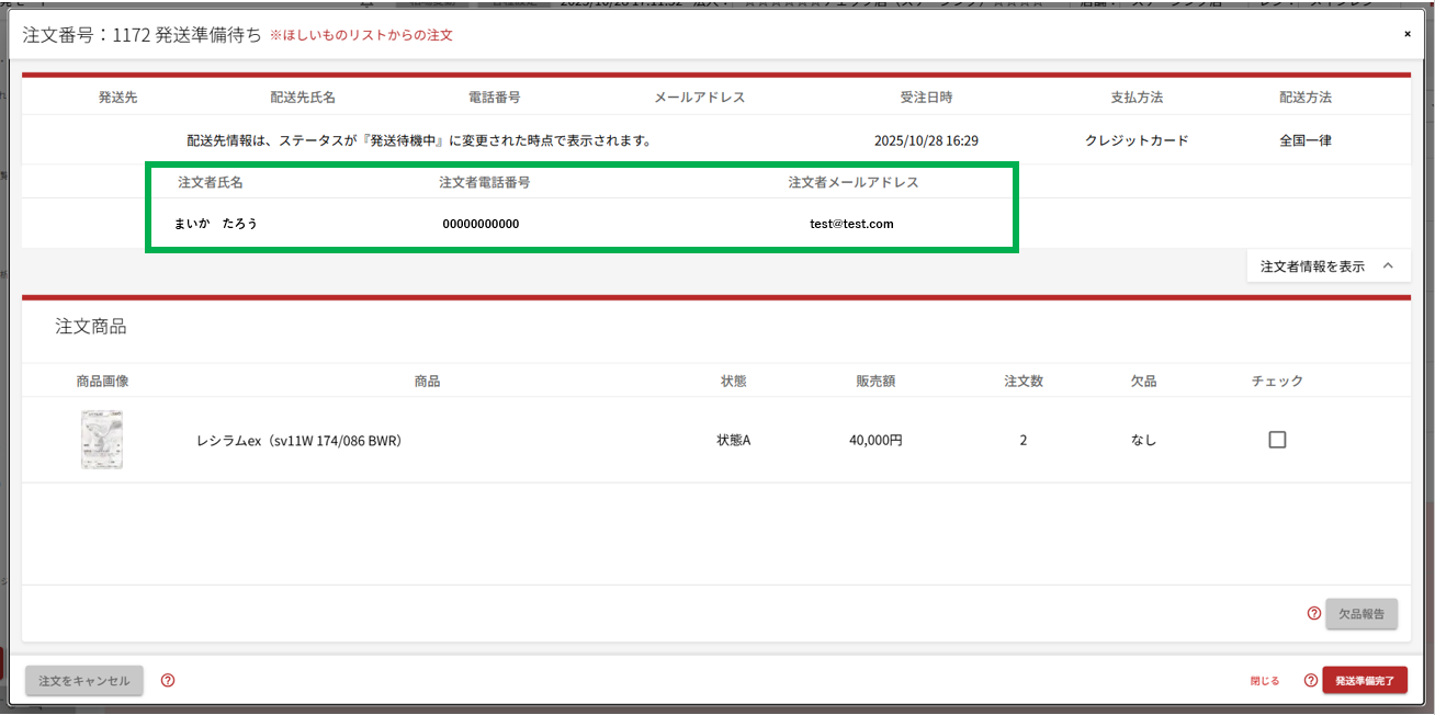 1. モーダル内で「発送準備を完了する」をクリックすると、ステータスが「発送待機中」に移行します。
