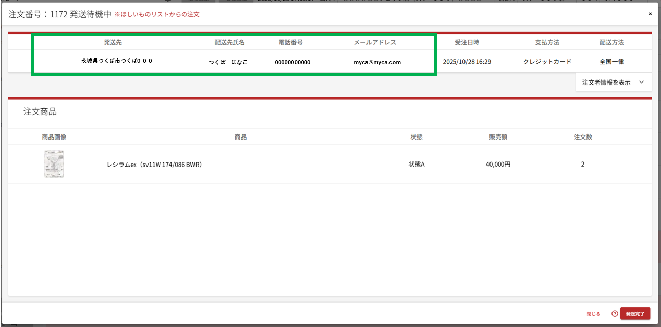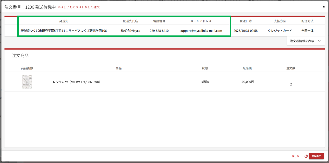 発送準備完了し、「発送待機中」にステータスを変更すると配送先情報が表示されます。