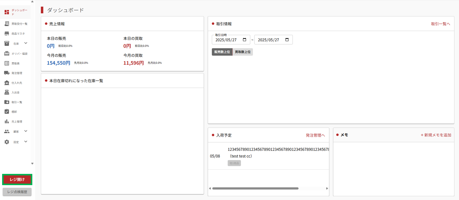 開店しているかを確認してください。サイドメニューの一番下に「レジ開け」と書いてある場合、閉店状態です。レジ開けを選択して開店作業を行ってください。