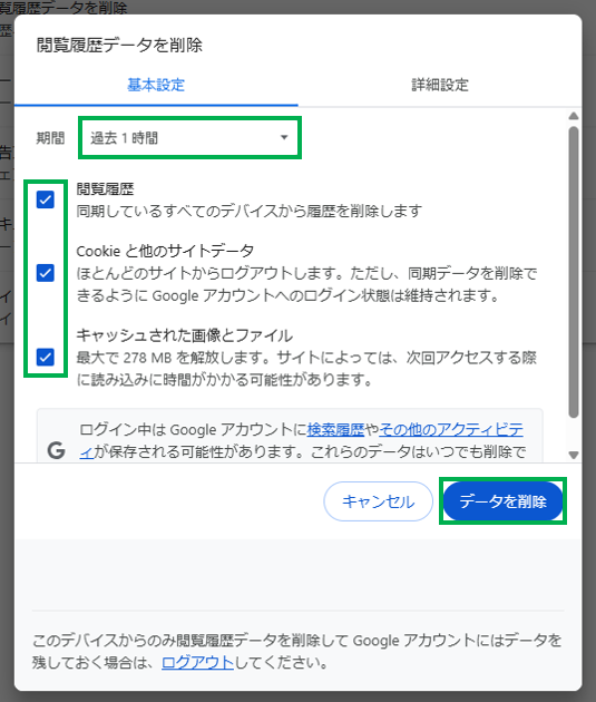 削除したい期間を選択して、チェックが入っていることを確認したら「データを削除」をクリックします。