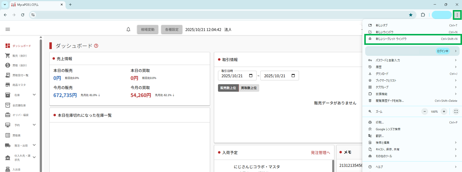 データを削除すると問題がある場合には、シークレットモードでPOSを開いてください。