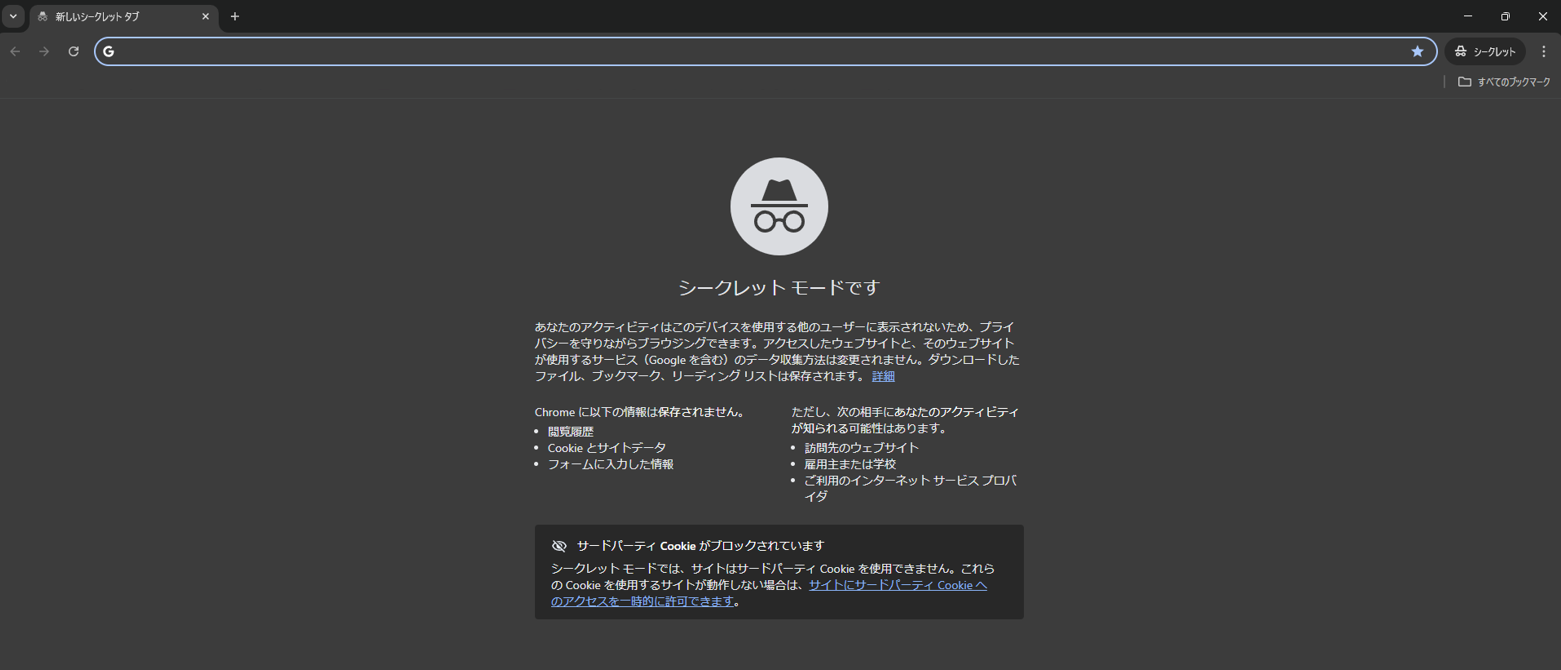 シークレットモードでは過去のデータが存在しないものとしてブラウザが動作します。