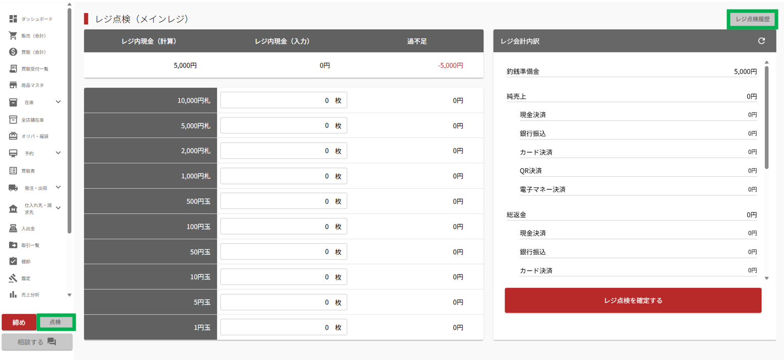 ・右上の「レジ点検履歴」を選択します。